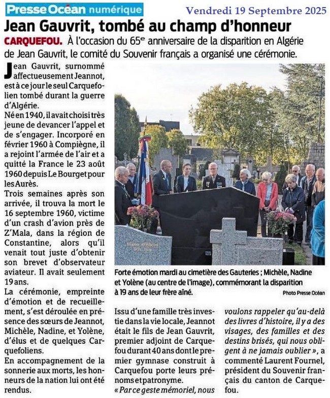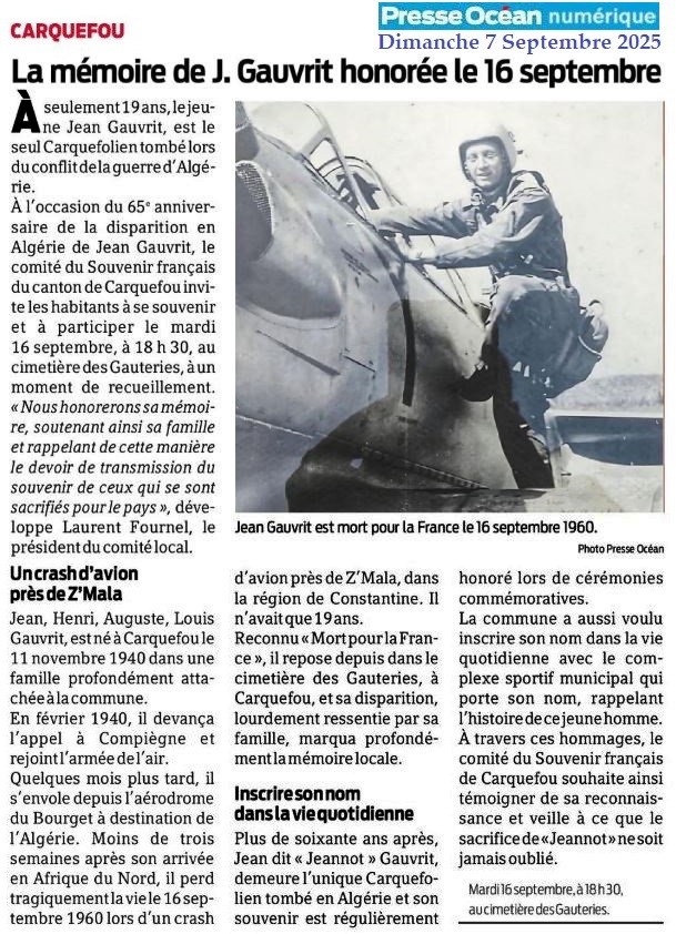 La mémoire de J. Gauvrit honorée le 16 septembre - Presse Océan 7 septembre 2025