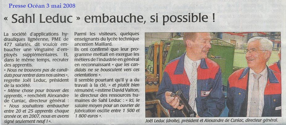 - Les écoles de la régions avaient demandé la possibilité de faire pour leurs élèves, des contrats de stages dans l’entreprise, compte tenu le nombre important et diversifié de machines outils. Au début, les stages étaient au mois de Juin. Par la suite, pour accueillir d’avantage de stagiaires, les stages se déroulaient toute l’année. Il y avait une quinzaine d’écoles de la région qui étaient intéressées, pour des contrats de stages de 3 ou 4 semaines en moyenne, concernant des jeunes du niveau CAP ou BAC. Vers 1990, l’entreprise accueillait environ 50 stagiaires par an. La S.A.H. Leduc a reçue le Premier Prix pour l’accueil des stagiaires, devant une entreprise de Renault des environs de Rennes.