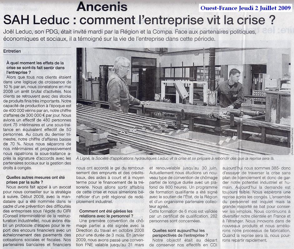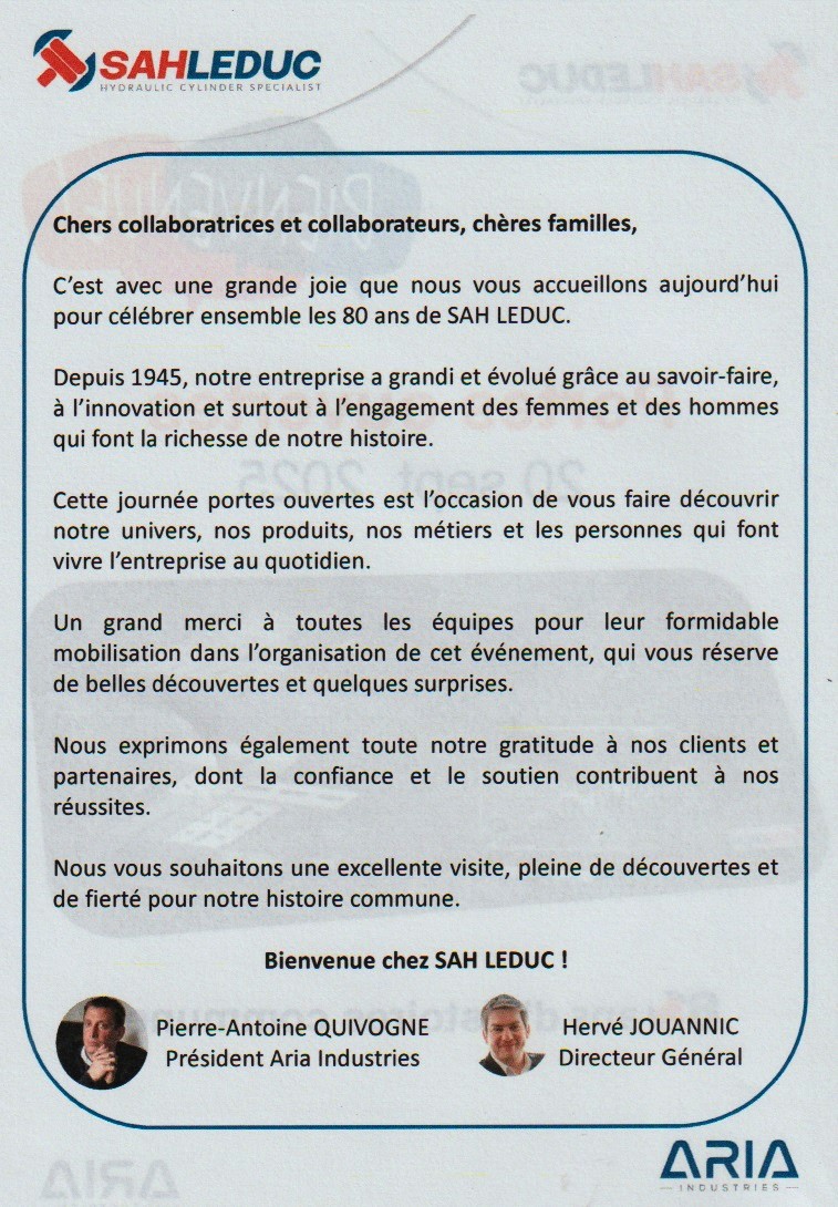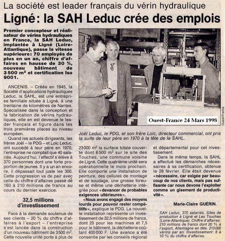 Bernard Leduc a commencé par fabriquer des machines à bois, principalement des scies circulaires sur table vers 1948, ensuite vers 1950 des essieux pour les remorques agricoles qui ont remplacés les charrettes, et vers 1960 les vérins hydrauliques. Au début de l’entreprise, c’était : Bernard Leduc Fabricant, puis : Société d’Exploitation des Etablissements Bernard Leduc, ensuite : Société d’Applications Hydrauliques Leduc (S.A.H.L.), et après la fusion avec les Etablissements Leduc à Ligné, c’est devenue : S.A.H. Leduc.
