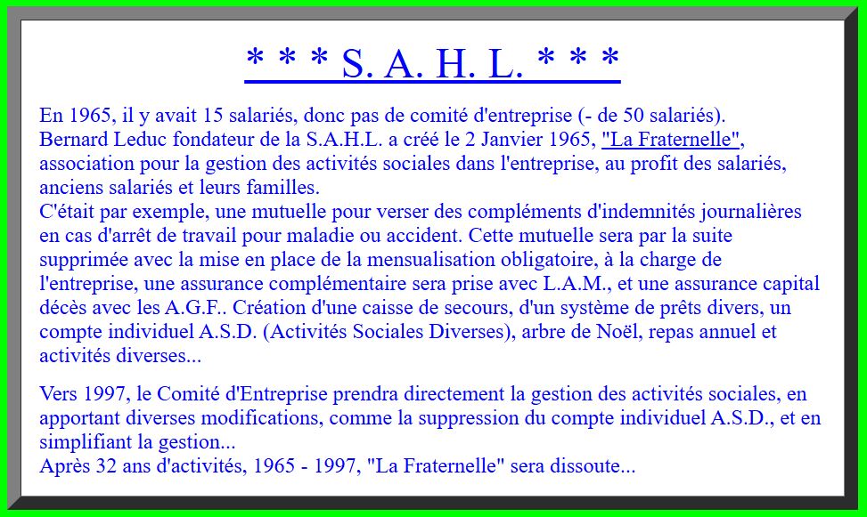 Bernard Leduc voulait également développer les activités sociales au profit des salariés, mais comme il n’y avait pas encore de comité d’entreprise, il avait créé une association appelée "La Fraternelle", et désigné Henri Lepage comme responsable de celle-ci, à compter du 2 Janvier 1965.