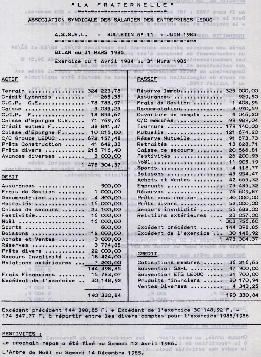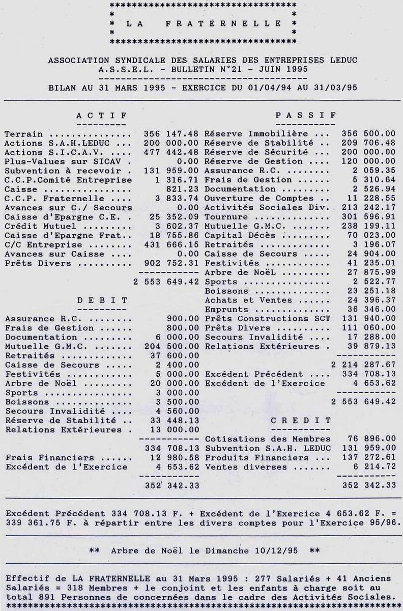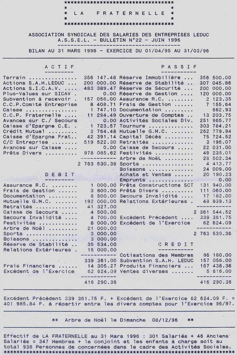 Les réserves de la Fraternelle étaient placées sur un compte de l’entreprise et dans plusieurs banques, prêts accordés aux salariés, les intérêts annuels étaient du même niveau que la subvention de l’entreprise aux activités sociales, ce qui n’était pas négligeable. Les comptes étaient contrôlés chaque année, pour l’expert comptable de l’entreprise. Bilan de la Fraternelle au 31 mars 1996.