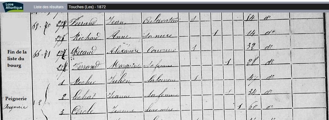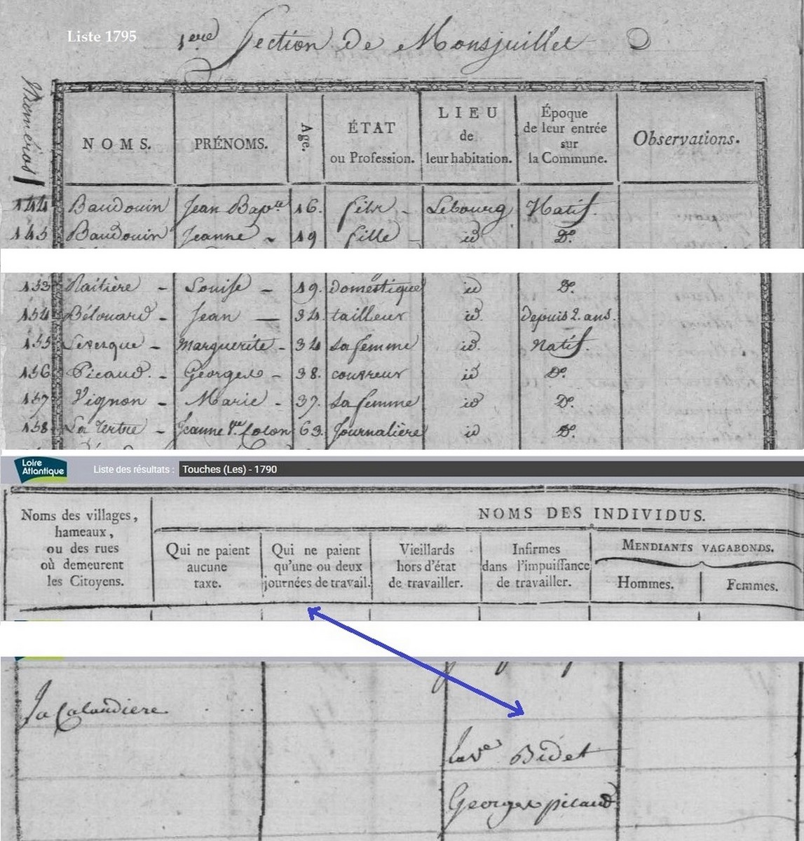 (La liste du recensement de 1795 sur Les Touches, est divisée en trois sections : du Monsjuillet, de la Grossière et du Meix).
