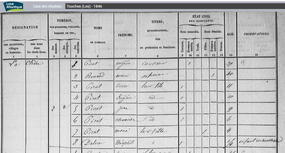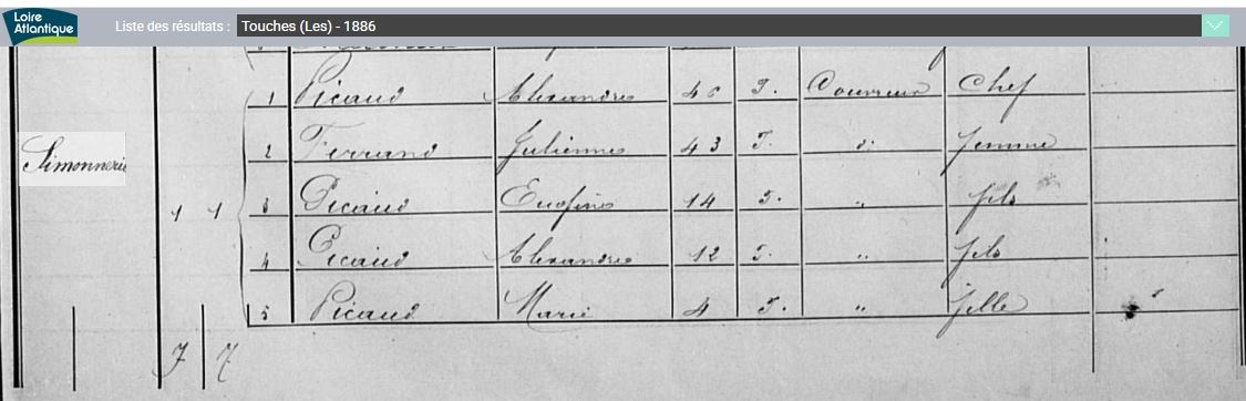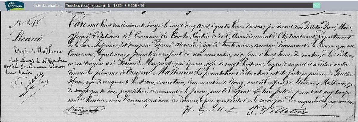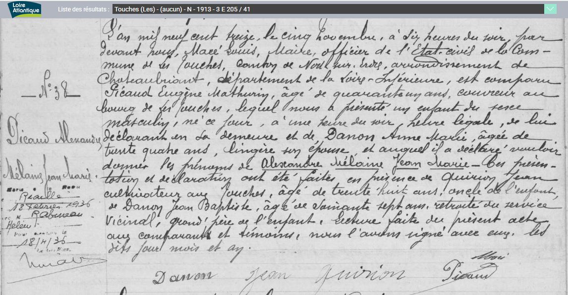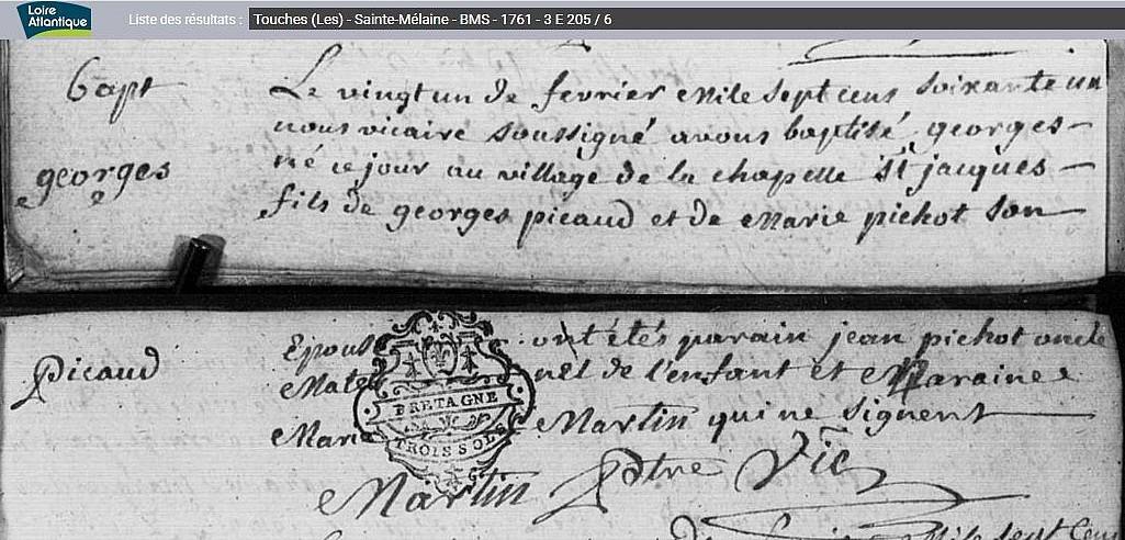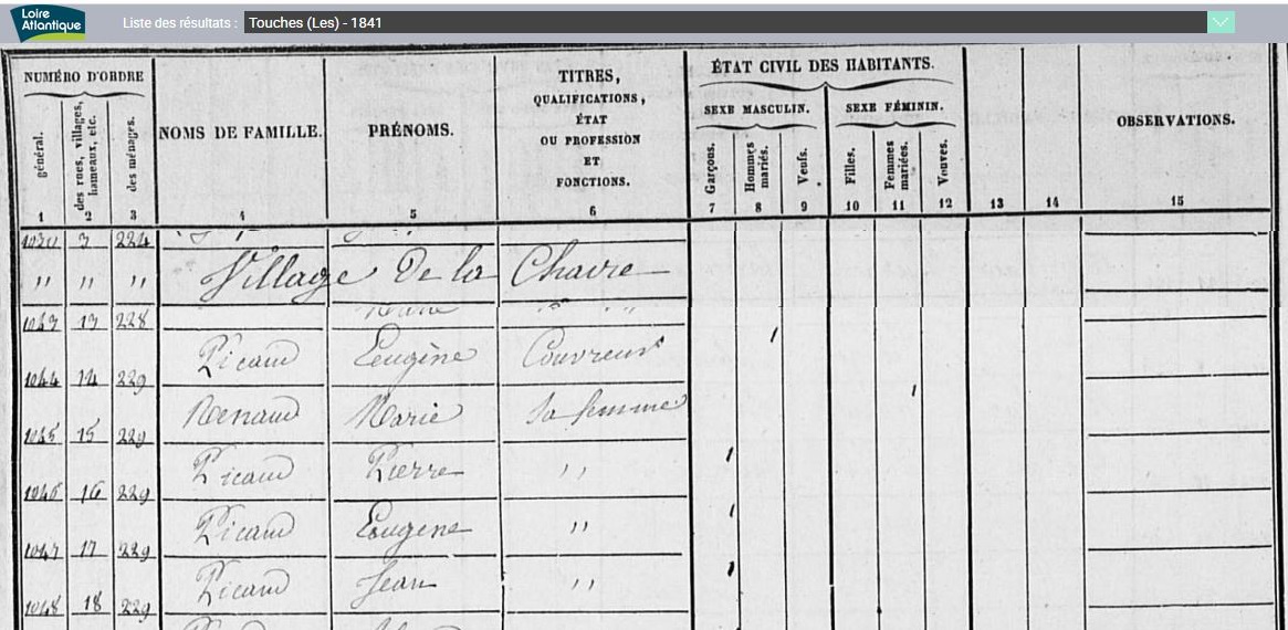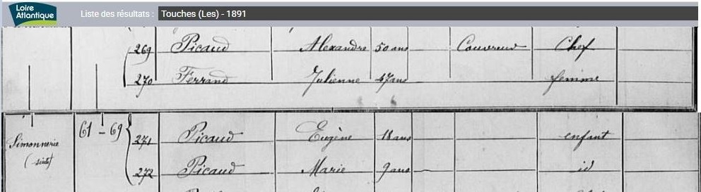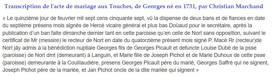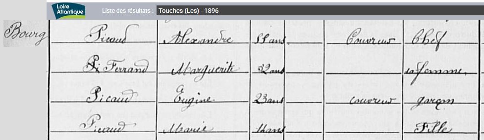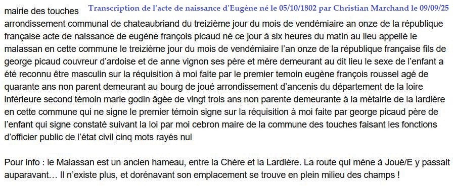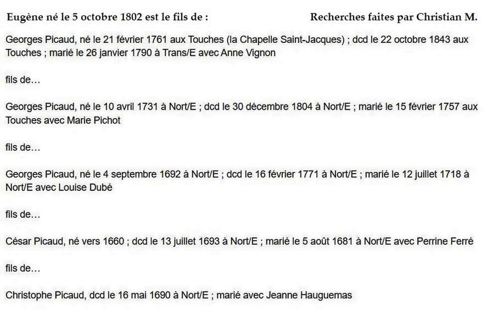 Historique Picaud 1761/1660 - Depuis 1757, il y a eu de père en fils un Picaud sur Les Touches avec Georges né le 10 avril 1731 à Nort sur Erdre, marié le 15 février 1757 aux Touches avec Marie Pichot. Son fils Georges né le 21 février 1761, avait 34 ans et non 38 sur l’extrait de 1795, où il est précisé couvreur, son fils Eugène, est né le 5 octobre 1802, au hameau le Malassan au village de la Chère.