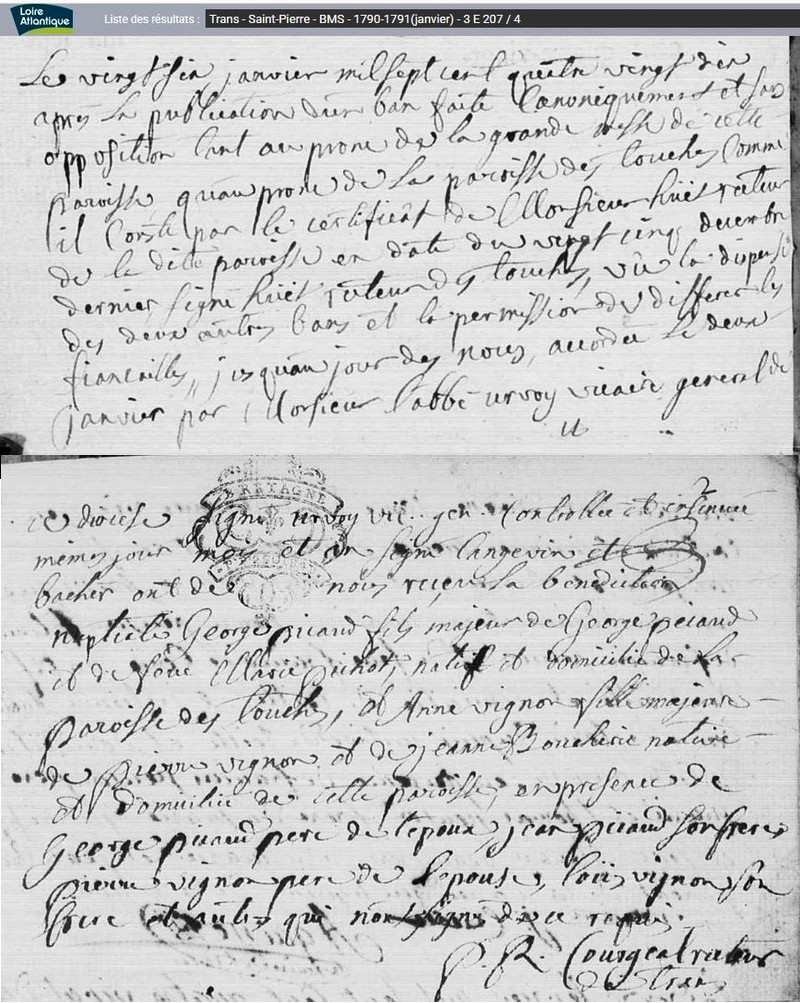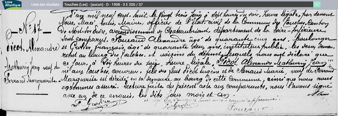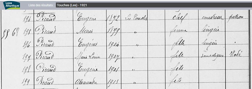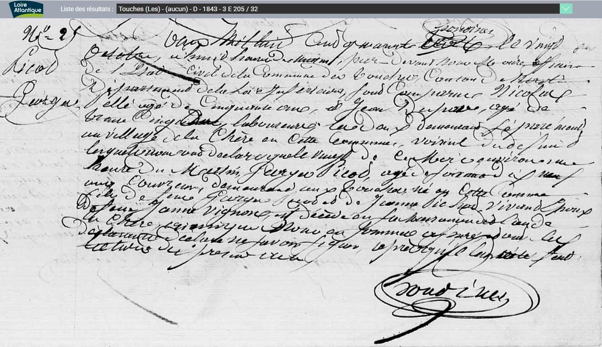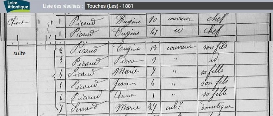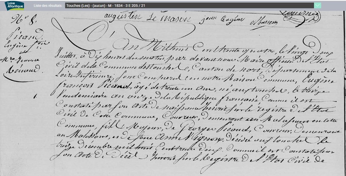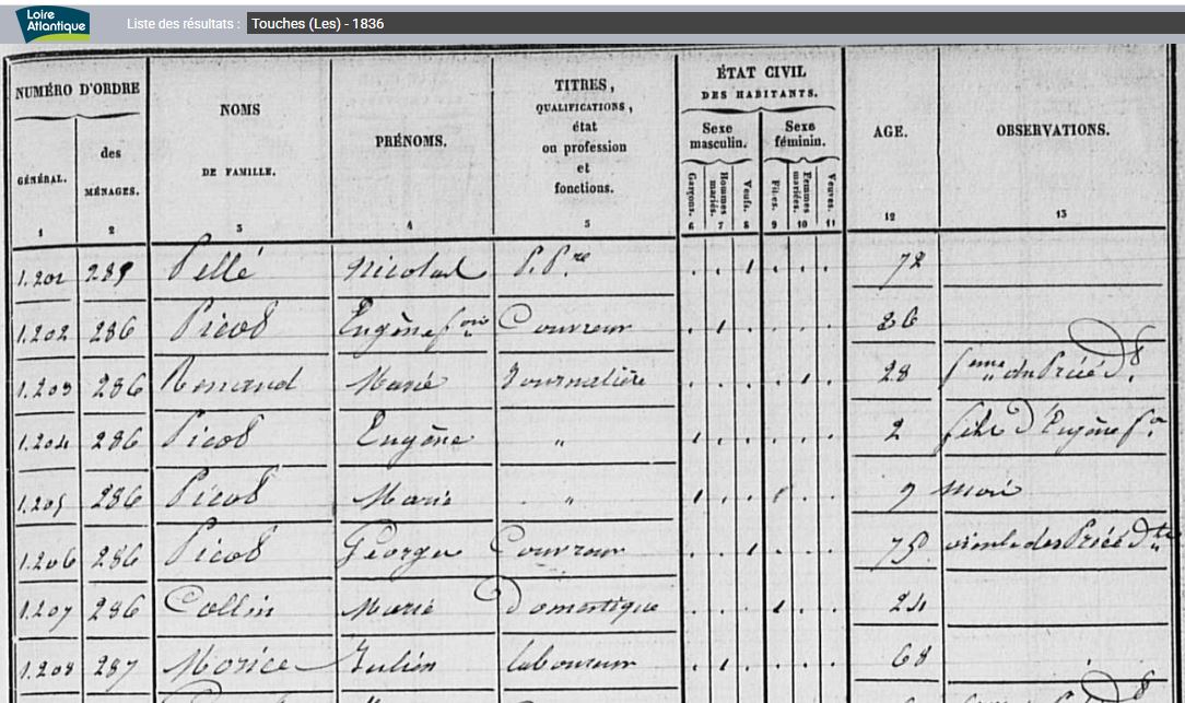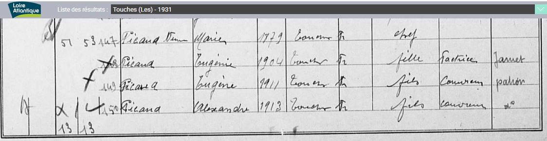 Historique Picaud 1761/1660 - Depuis 1757, il y a eu de père en fils un Picaud sur Les Touches avec Georges né le 10 avril 1731 à Nort sur Erdre, marié le 15 février 1757 aux Touches avec Marie Pichot. Son fils Georges né le 21 février 1761, avait 34 ans et non 38 sur l’extrait de 1795, où il est précisé couvreur, son fils Eugène, est né le 5 octobre 1802, au hameau le Malassan au village de la Chère.