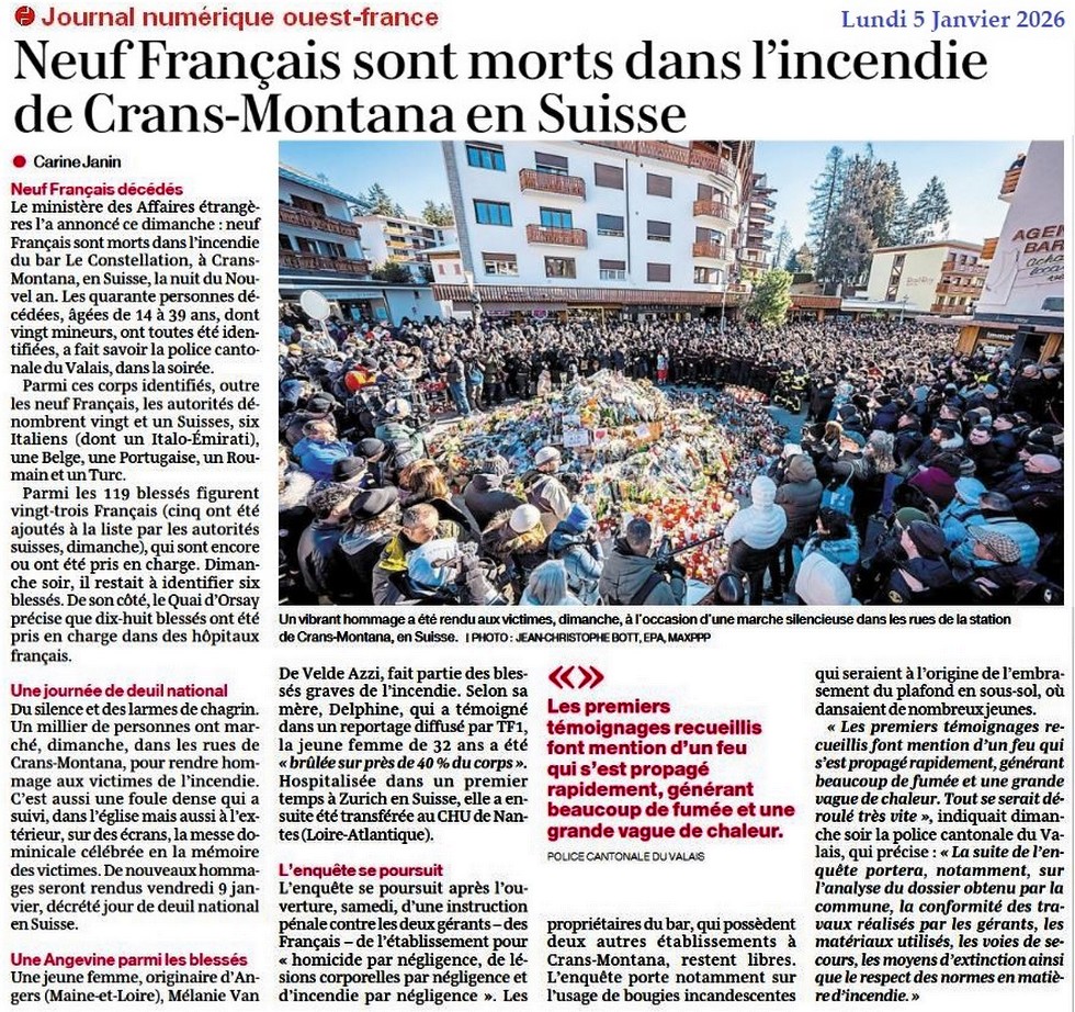 Neuf Français sont morts dans l’incendie en Suisse - Ouest-France 5 janvier 2026