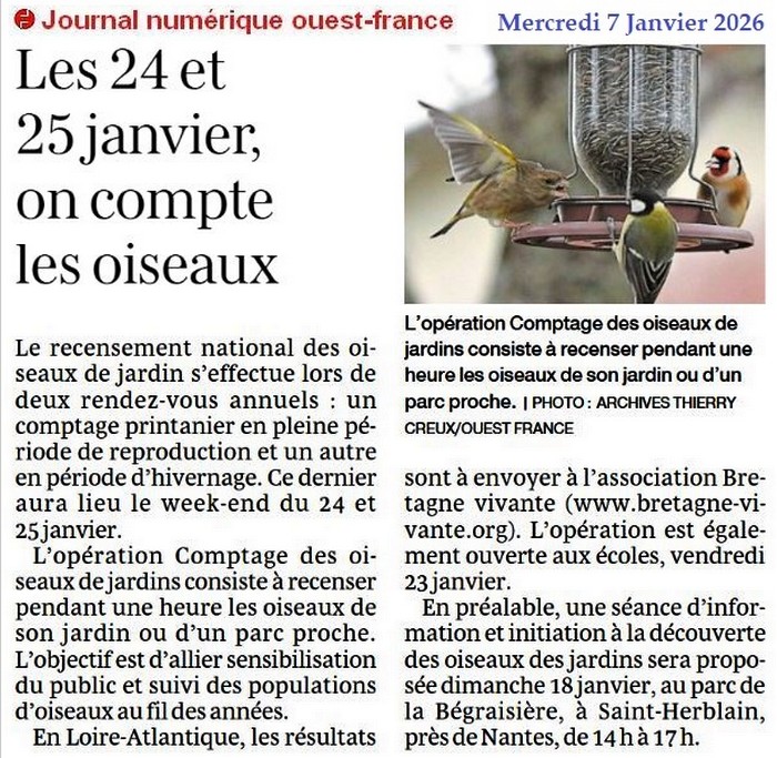 Les 24 et 25 janvier, on compte les oiseaux - Ouest-France 7 janvier 2026