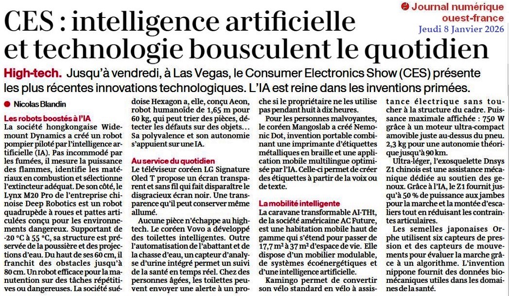 Intelligence artificielle et technologie bousculent le quotidien - Ouest-France 8 janvier 2026
