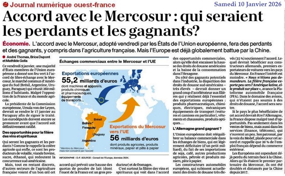 Mercosur : qui seraient les perdants et les gagnants ? - Ouest-France 10 janvier 2026