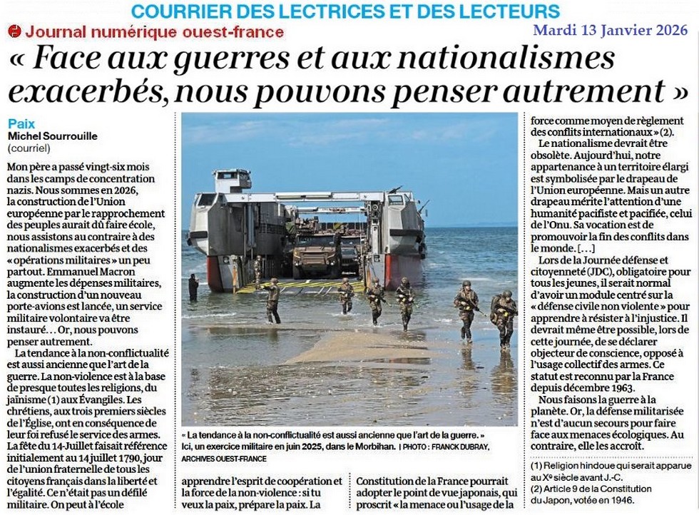 « Face aux guerres, nous pouvons penser autrement » - Ouest-France 13 janvier 2026