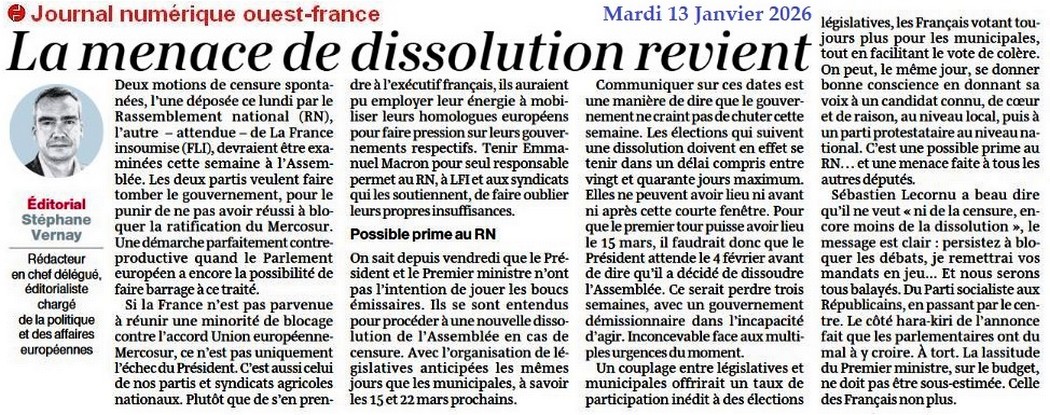 La menace de dissolution revient - Ouest-France 13 janvier 2026