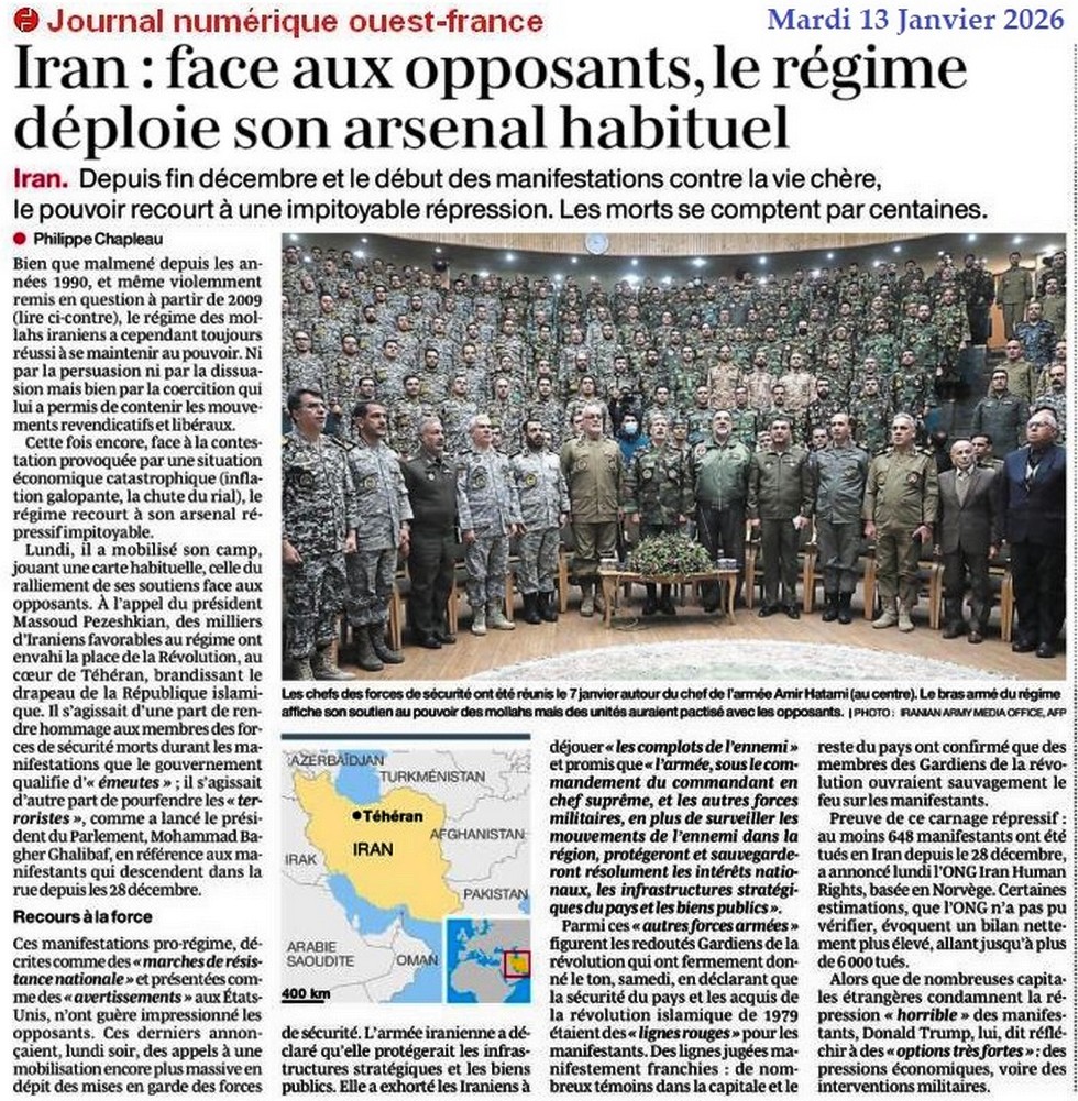 Iran : le régime déploie son arsenal habituel - Ouest-France 13 janvier 2026