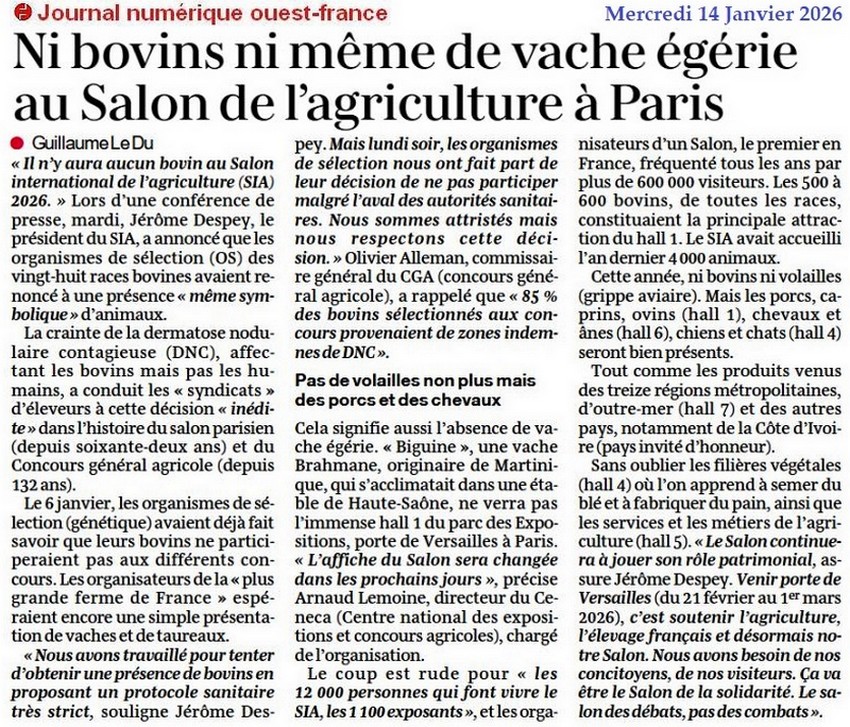 Salon de l’agriculture à Paris - Ouest-France 14 janvier 2026