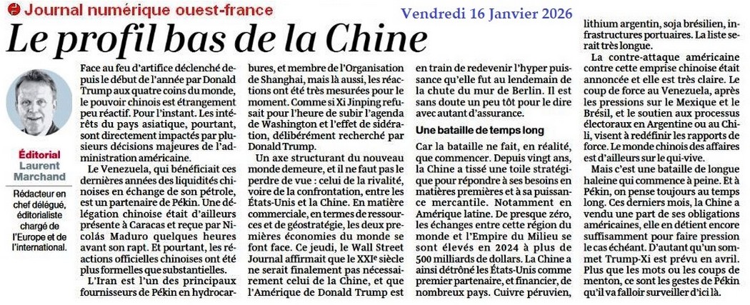 Le profil bas de la Chine - Ouest-France 16 janvier 2026