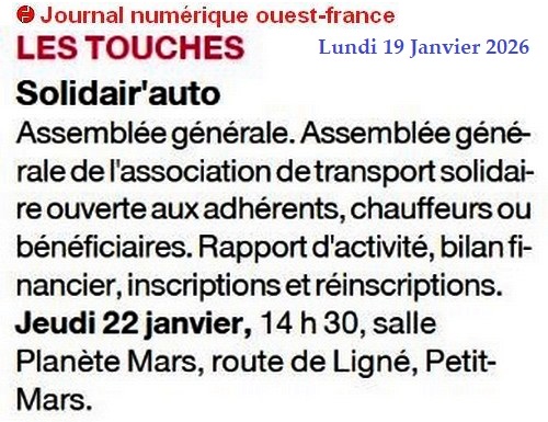 Solidair’auto jeudi 22 janvier à 14 h. 30 à Petit-Mars - Ouest-France 19 janvier 2026