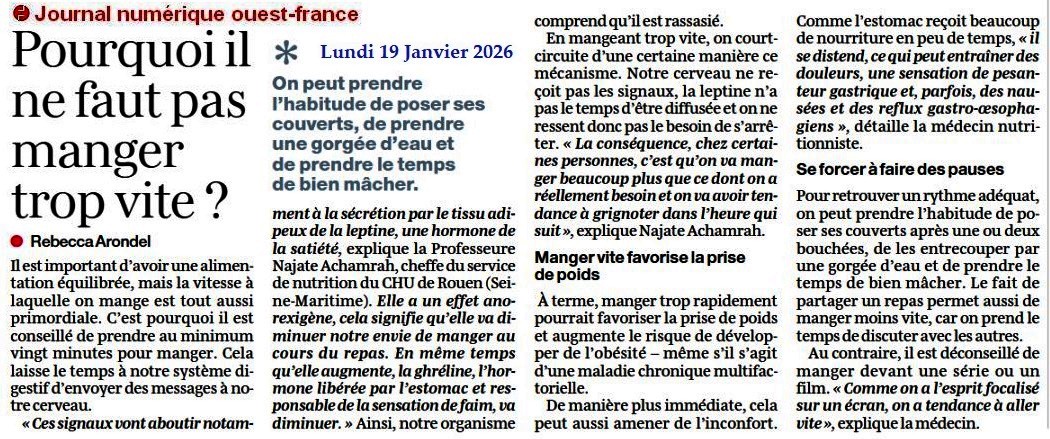 Pourquoi il ne faut pas manger trop vite ? - Ouest-France 19 janvier 2026