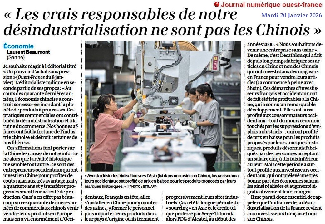 « Les vrais responsables de notre désindustrialisation ne sont pas les Chinois » - Ouest-France 20 janvier 2026