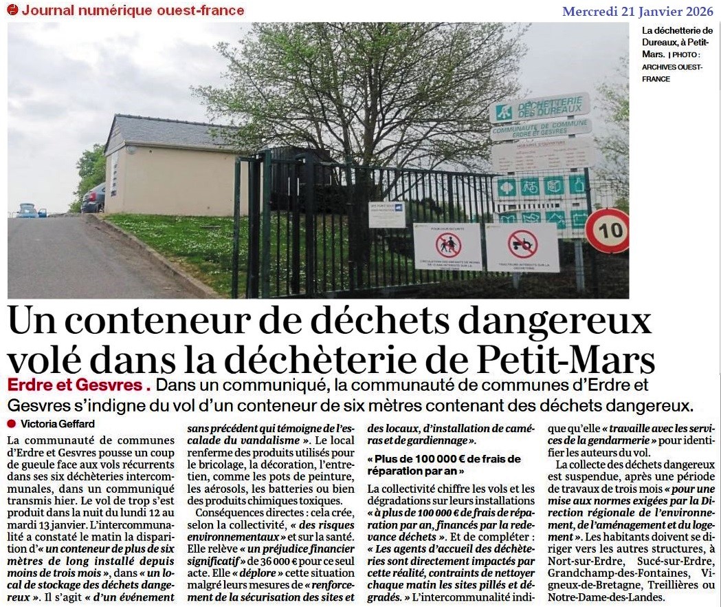 Un conteneur de déchets dangereux volé dans la décheterie de Petit-Mars - Ouest-France 21 janvier 2026