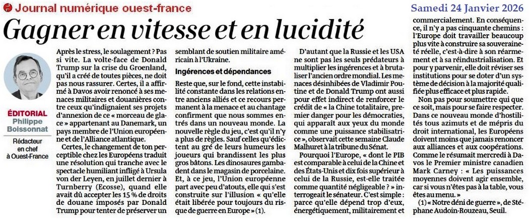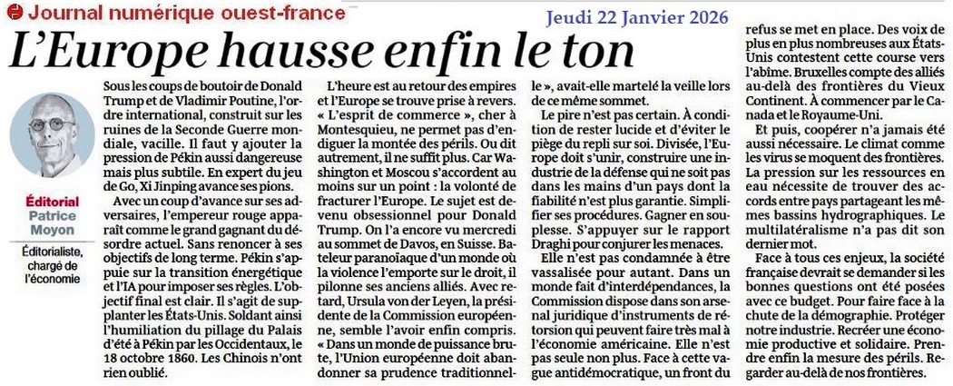 L’Europe hausse enfin le ton - Ouest-France 22 janvier 2026
