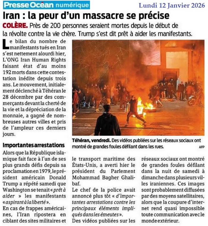 Iran : la peur d’un massacre se précise - Presse Océan 12 janvier 2026