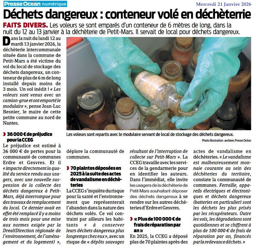 Déchets dangereux : conteneur volé en déchèterie - Presse Océan 21 janvier 2026