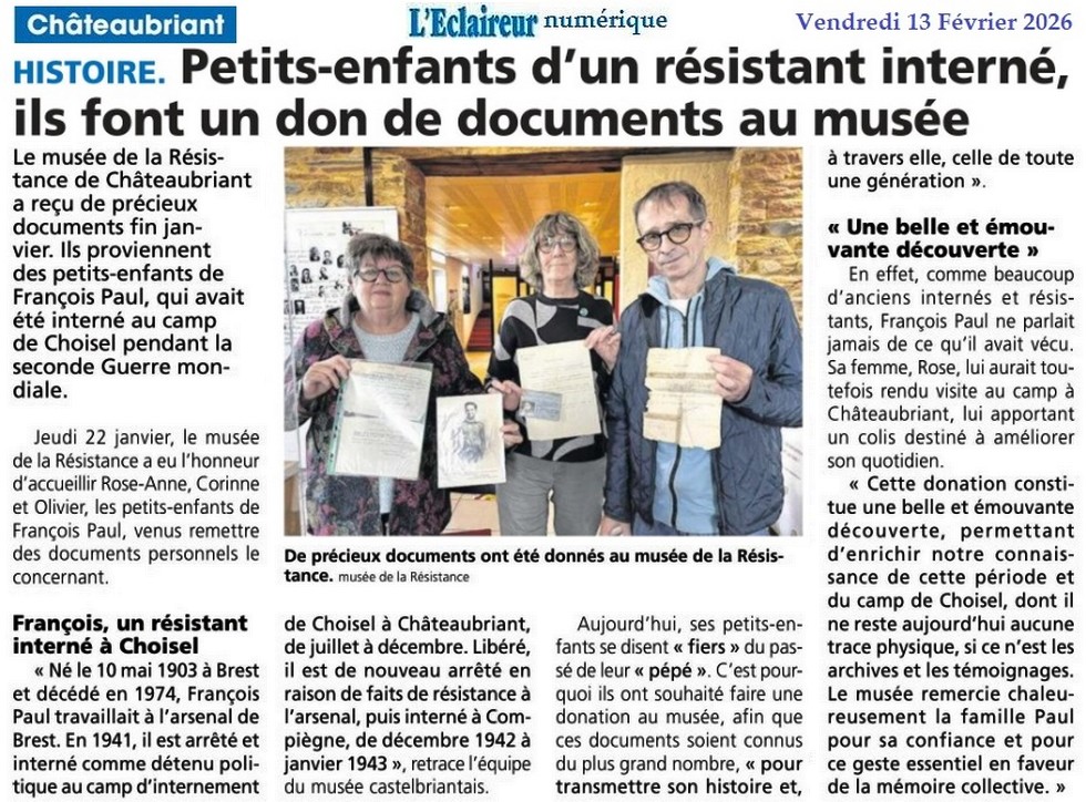 Petits enfants d’un résistant interné, ils font un don au musée - L’Eclaireur 13 février 2026