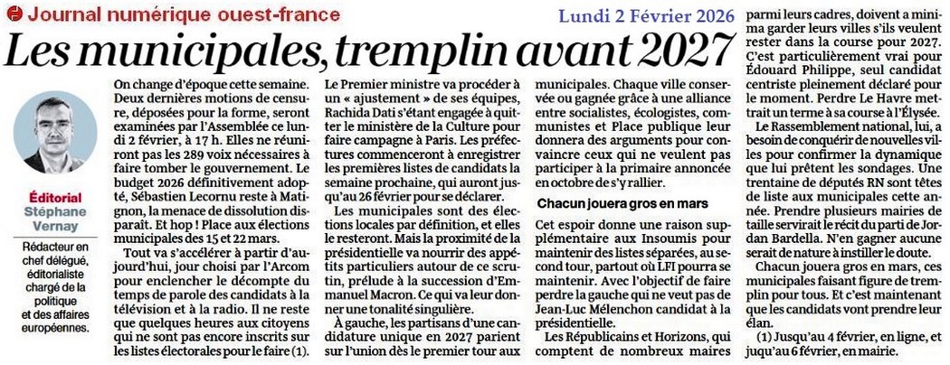 Les municipales, tremplin avant 2027 - Ouest-France 2 février 2026