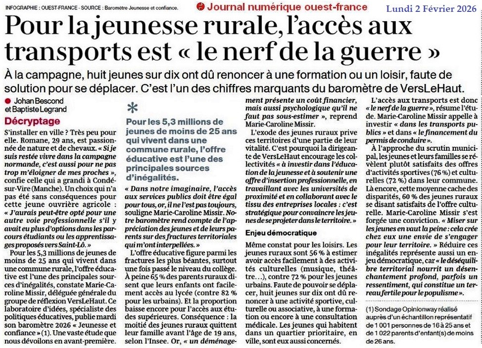 Pour la jeunesse rurale, l’accès aux transports est « le nerf de la guerre » - Ouest-France 2 février 2026