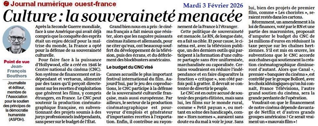 Culture : la souveraineté menacée - Ouest-France 3 février 2026