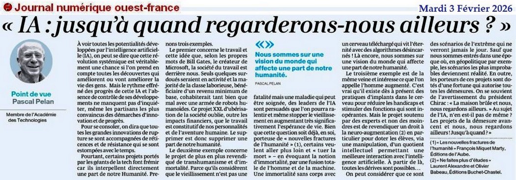 « IA : jusqu’à quand regarderons-nous ailleurs ? » - Ouest-France 3 février 2026