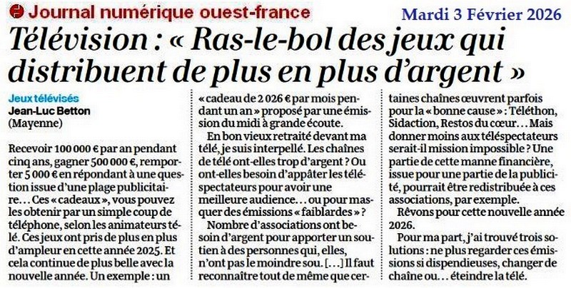 Télévision : « Ras-le-bol des jeux qui distribuent de plus en plus d’argent » - Ouest-France 3 février 2026