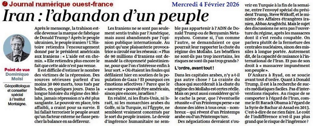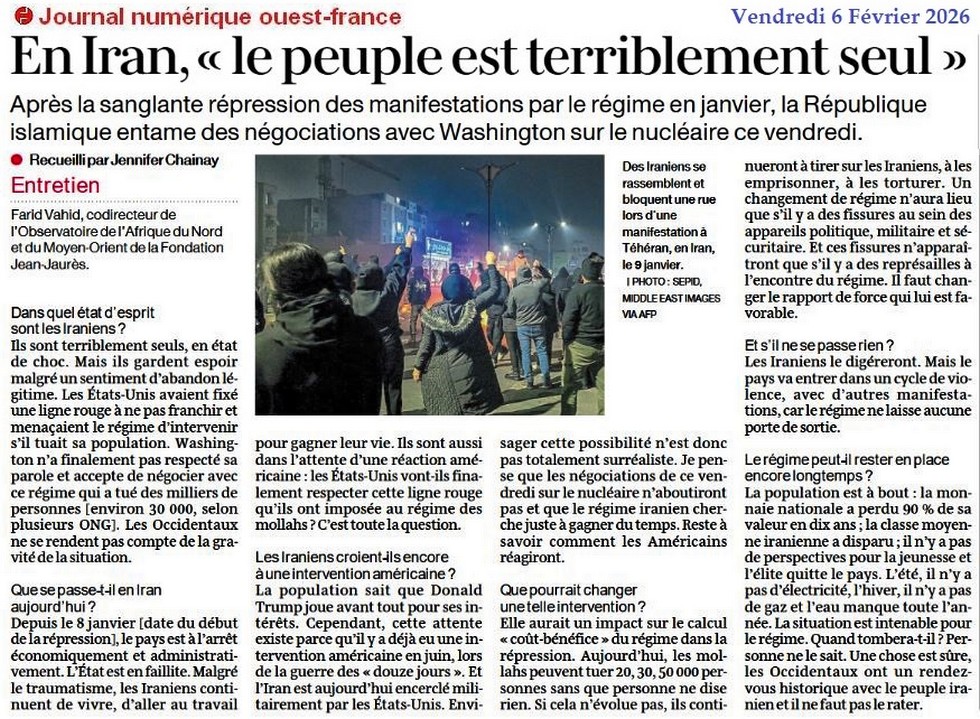 Iran : l’abandon d’un peuple - Ouest-France 4 février 2026