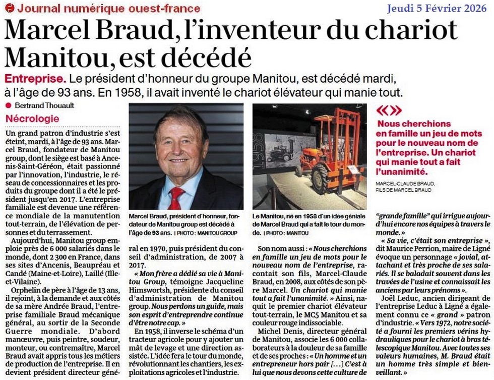 Marcel Braud, l’inventeur du chariot Manitou, est décédé - Ouest-France 5 février 2026