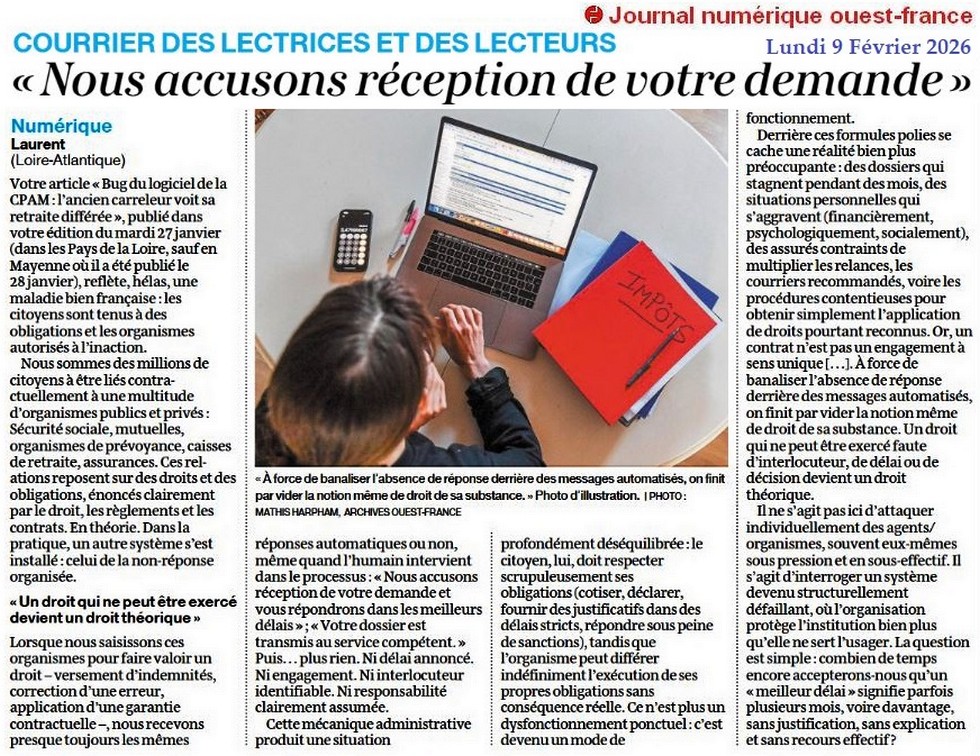 « Nous accusons réception de votre demande » - Ouest-France 9 février 2026