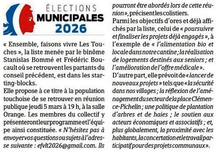 La liste « Ensemble, faisons vivre Les Touches » - Presse Océan 10 février 2026 - 1/4