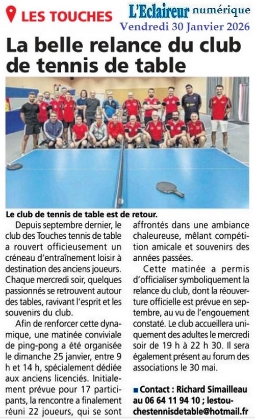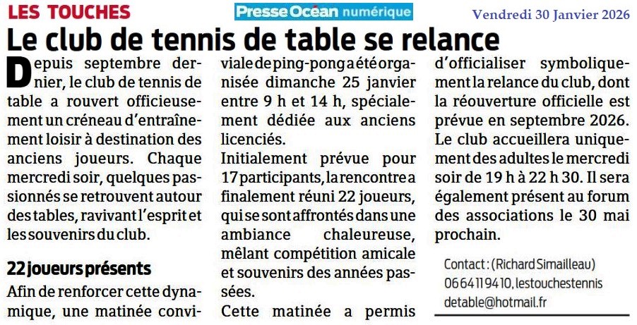 Le club de tennis de table se relance - Presse Océan 30 janvier 2026