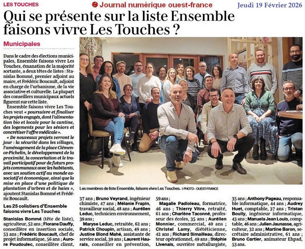Qui se présent sur la liste Ensemble faisons vivre Les Touches ? - Ouest-France 19 février 2026