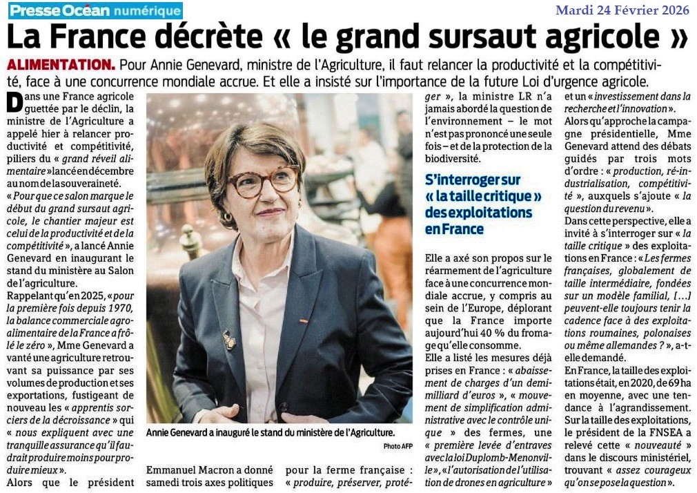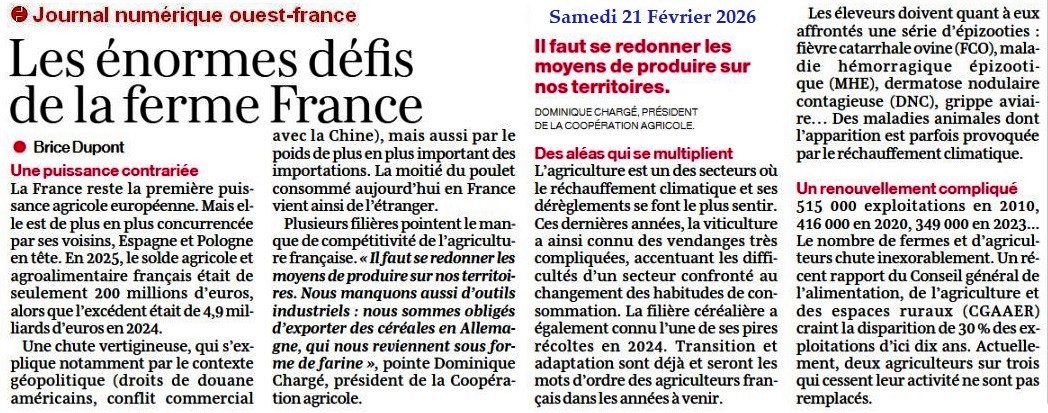 Les énormes défis de la ferme France - Ouest-France 21 février 2026