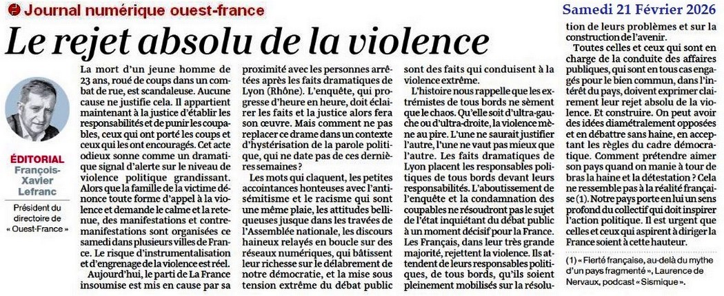 Le rejet absolu de la violence - Ouest-France 21 février 2026