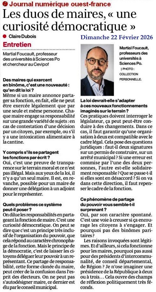Les duos de maires, « une curiosité démocratique » - Ouest-France 22 février 2026