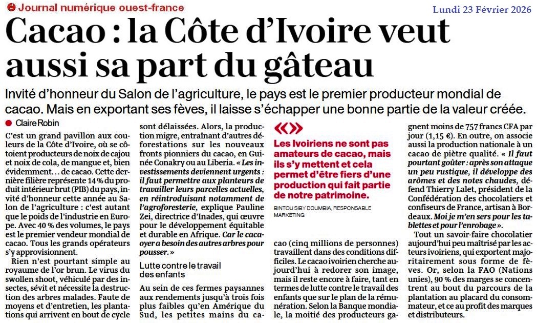 Cacao : la Côte d’Ivoire veut aussi sa part du gâteau - Ouest-France 23 février 2026