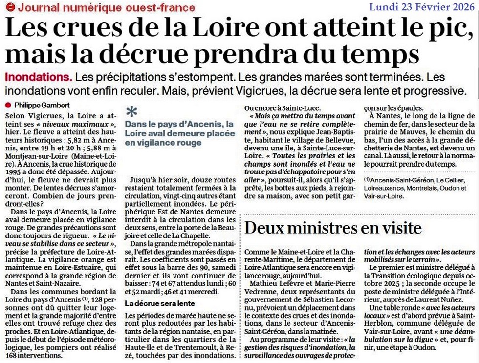Les crues de la Loire ont atteint le pic, mais la décrue prendra du temps - Ouest-France 23 février 2026