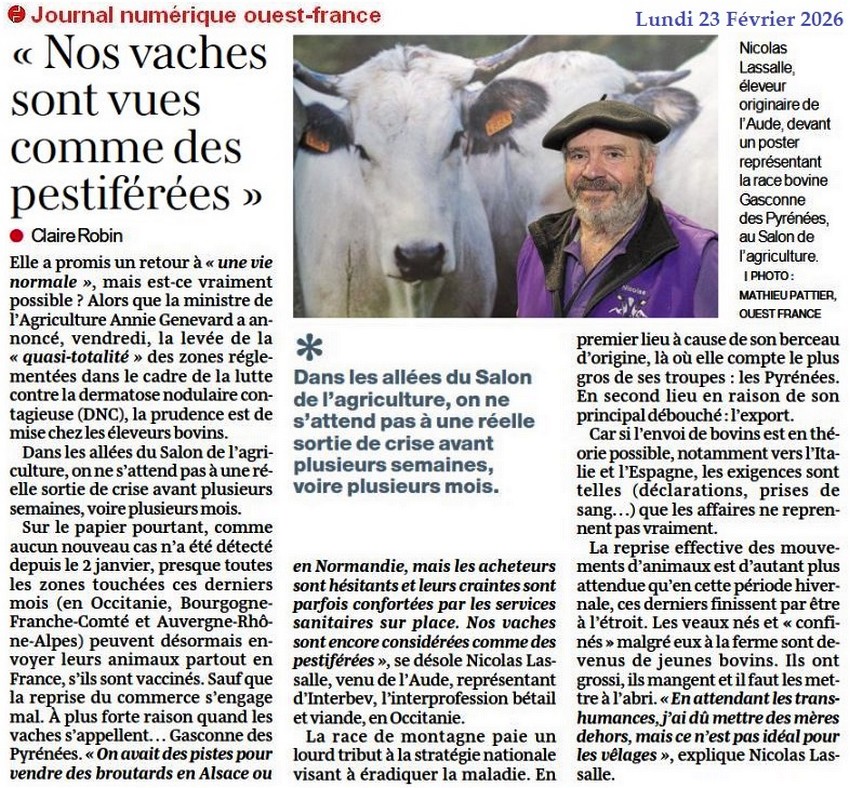 « Nos vaches sont vues comme des pestiférées » - Ouest-France 23 février 2026