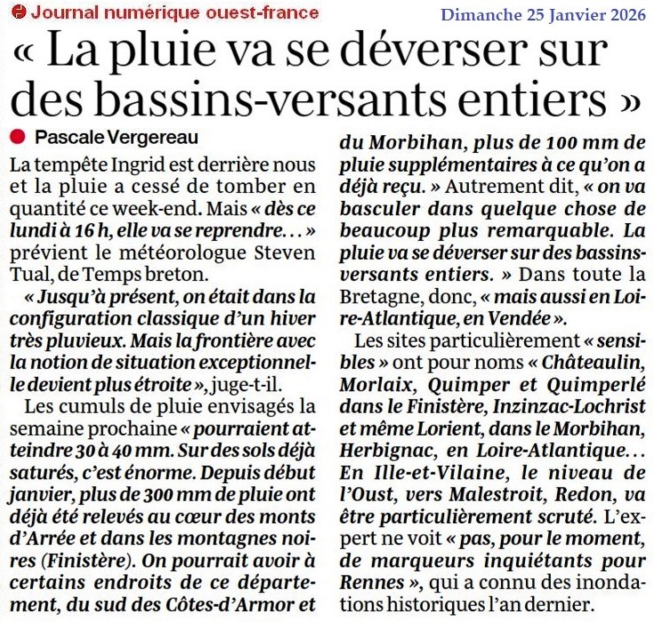 « La pluie va se déverser sur des bassins-versants entiers » - Ouest-France 25 janvier 2026