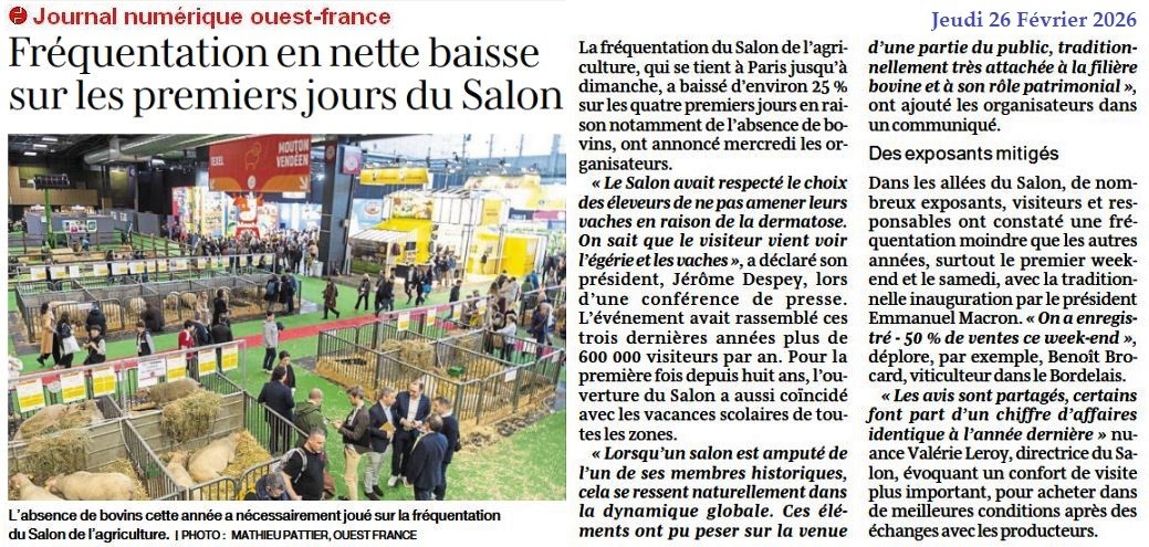 Fréquentation en nette baisse au Salon de l’agriculture - Ouest-France 26 février 2026