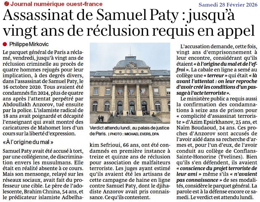 Assassinat de Samuel Paty : jusqu’à vingt ans de réclusion requis en appel - Ouest-France 28 février 2026