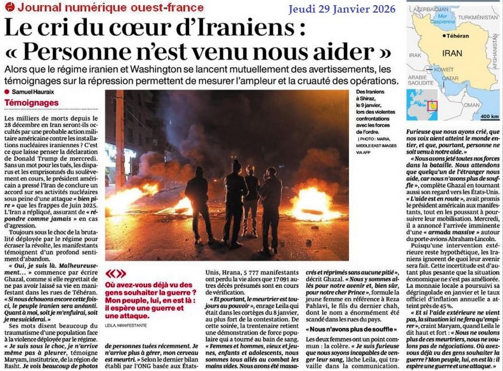 Le cri du cœur d’Iraniens : « Personne n’est venu nous aider » - Ouest-France 29 janvier 2026