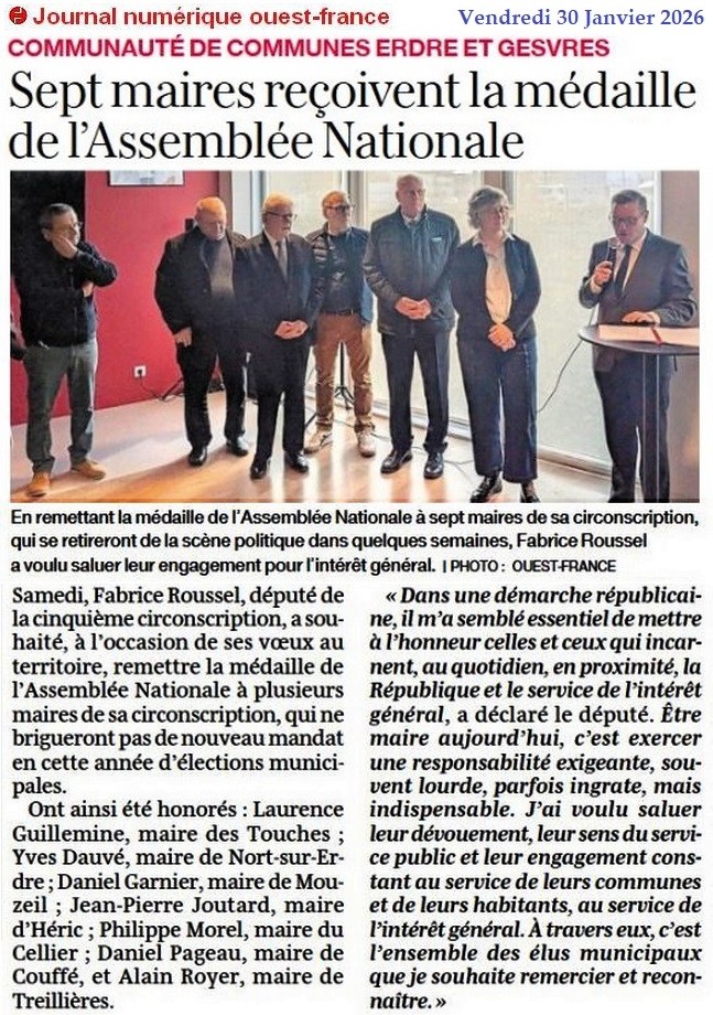Sept maires reçoivent la médaille de l’Assemblée Nationale - Ouest-France 30 janvier 2026