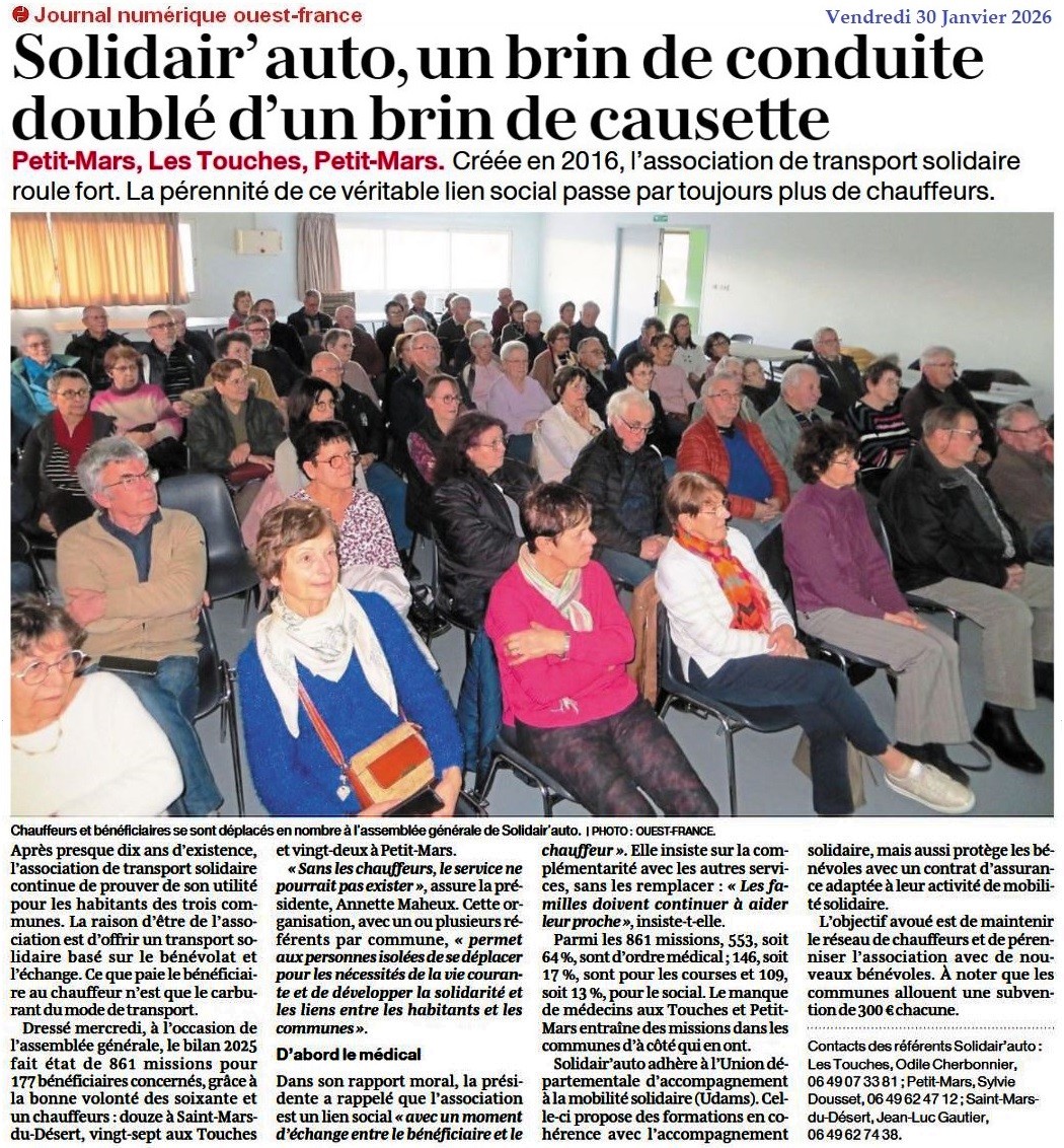 Solidair’auto jeudi 22 janvier à 14 h. 30 à Petit-Mars - Ouest-France 19 janvier 2026