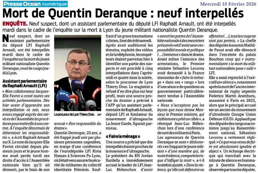 Mort de Quentin Deranque : neuf interpellés - Presse Océan 18 février 2026