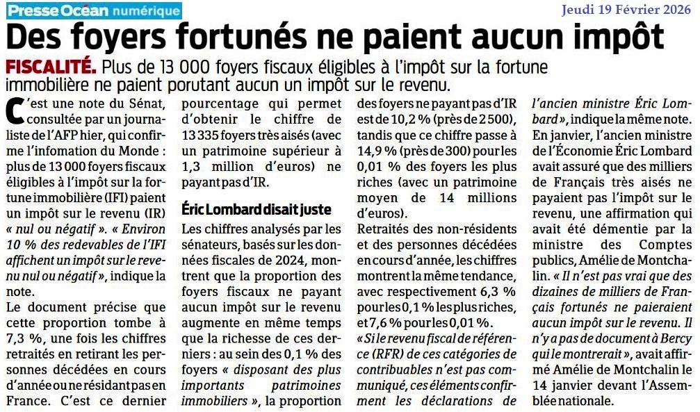 Des foyers fortunés ne paient aucun impôt - Presse Océan 19 février 2026